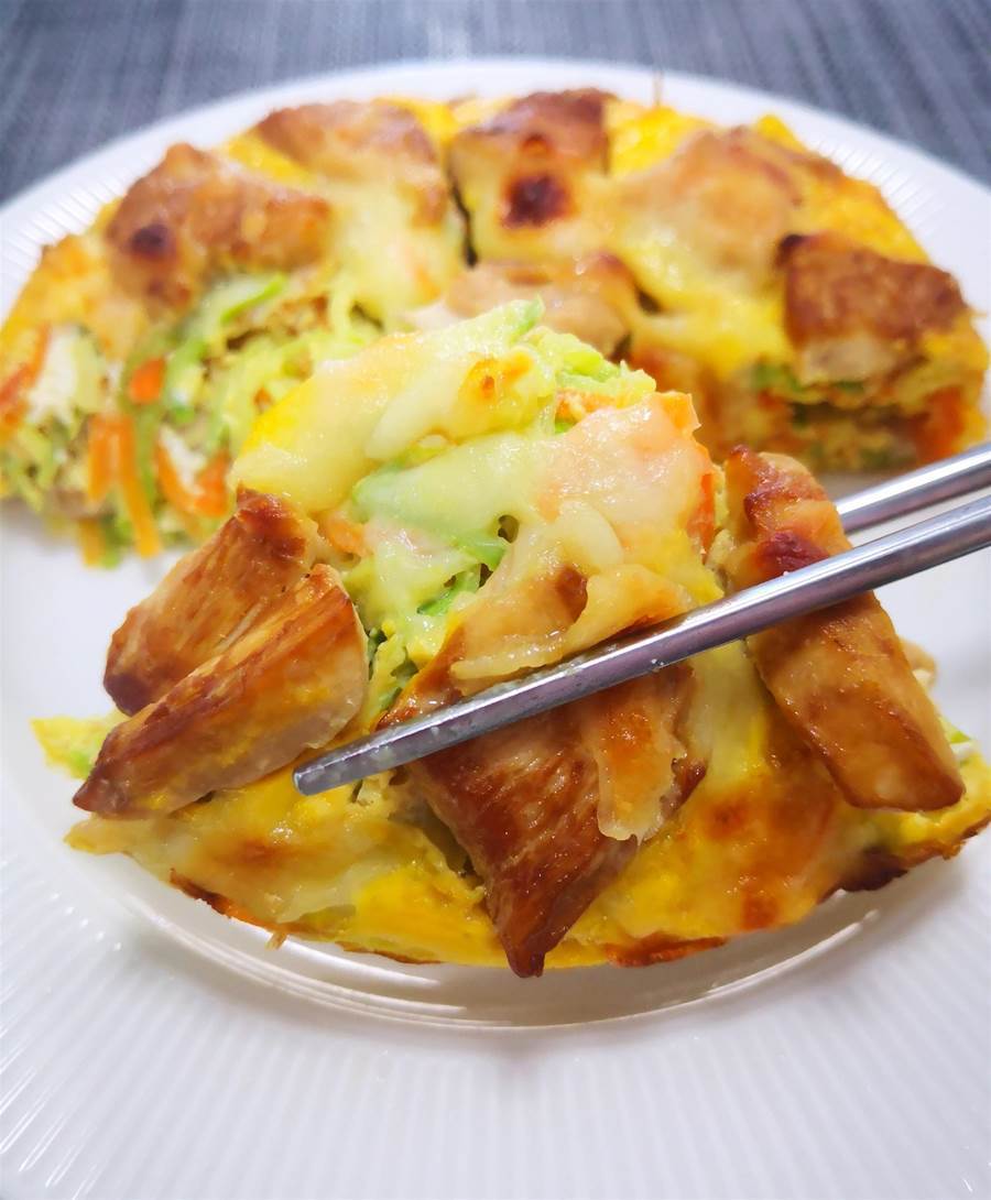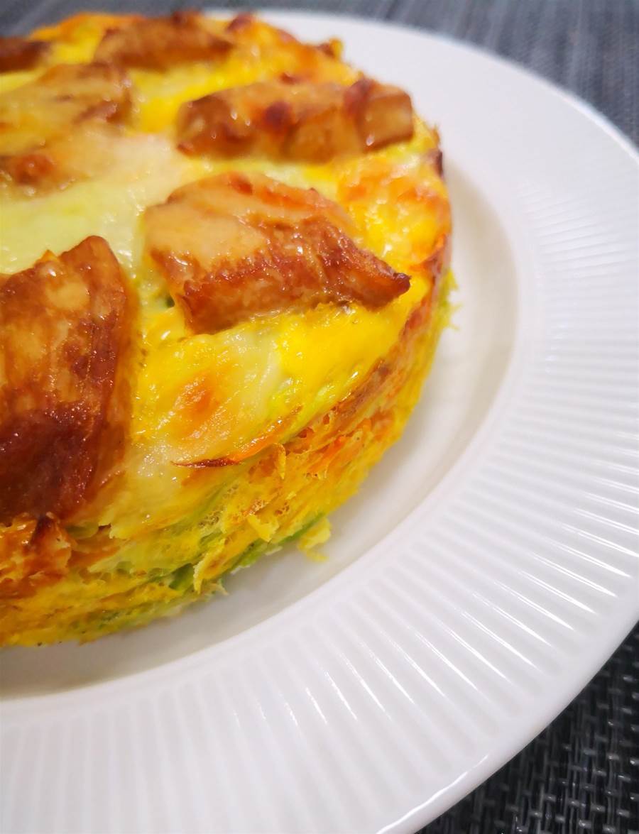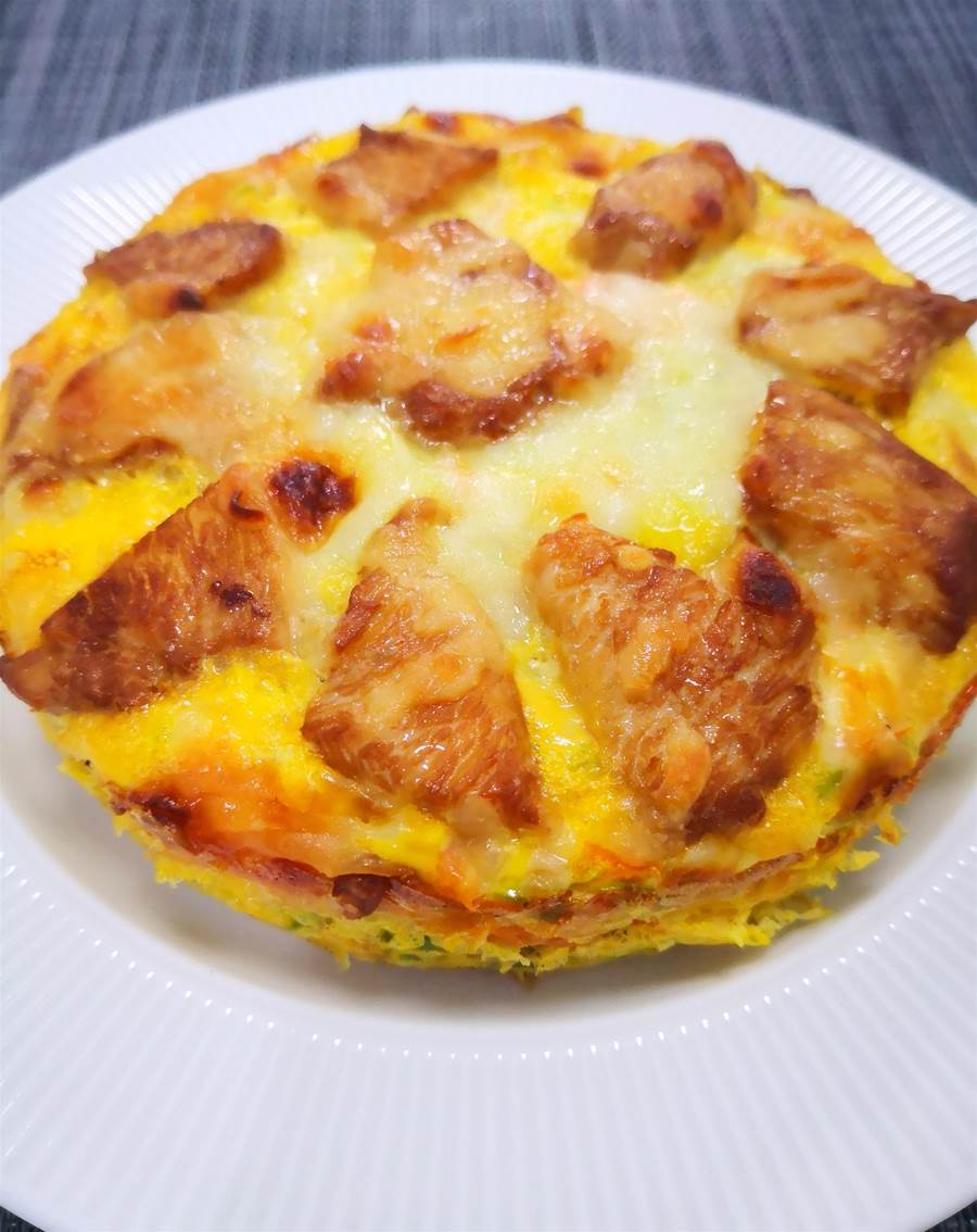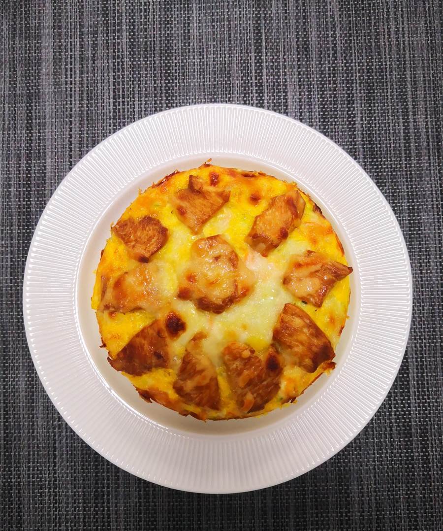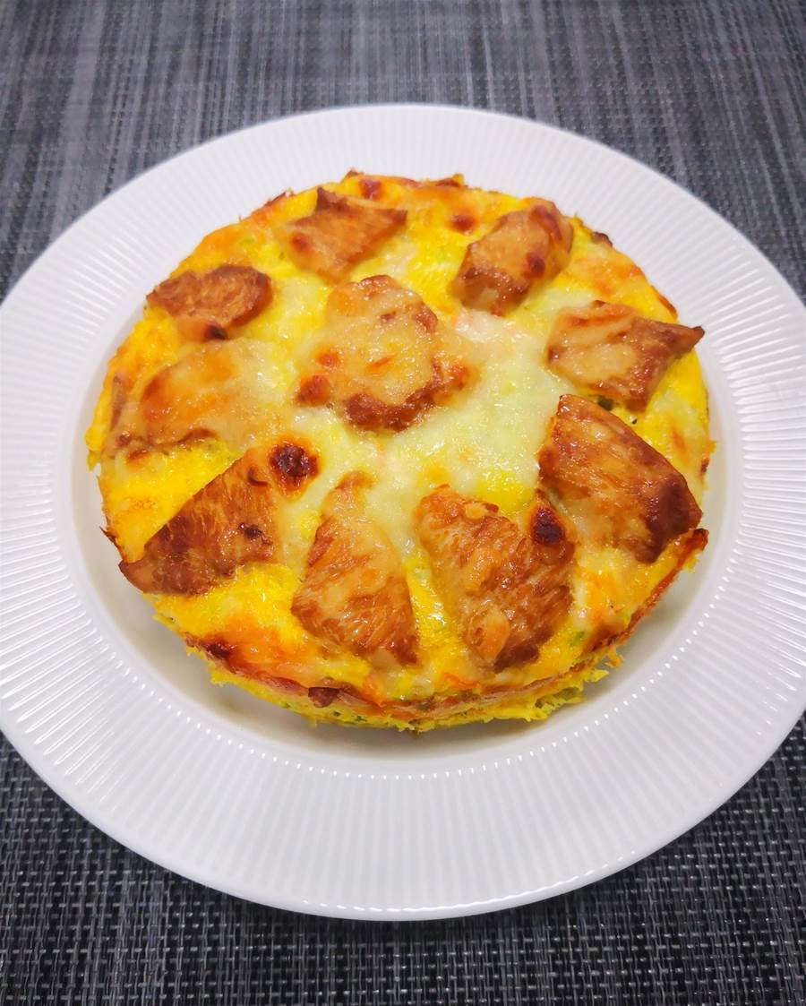 烤至蛋液凝固、芝士全部融化即可,烤好后用小水果刀順著烤碗內側邊緣劃一圈再倒扣在盤子上,揭掉底部油紙。