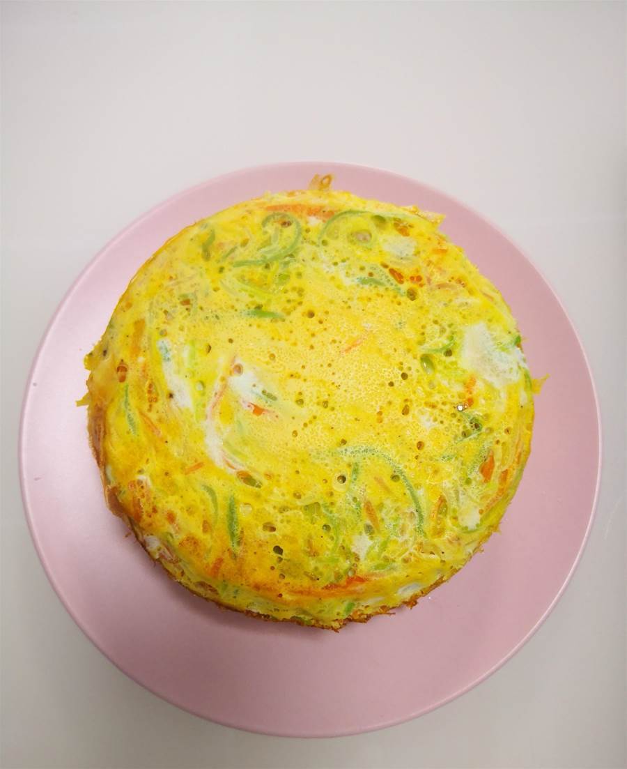 繼續倒入剩下的西葫蘆雞蛋液,繼續用勺子背面把表面輕按平整。
