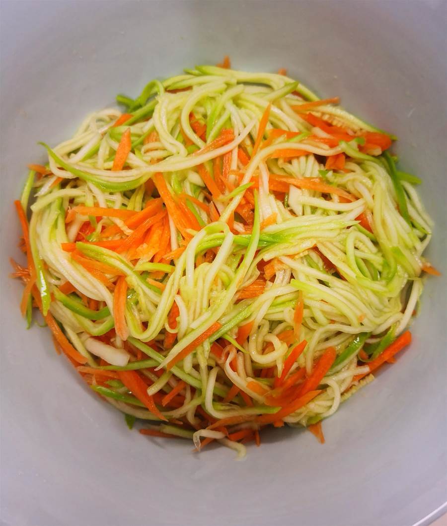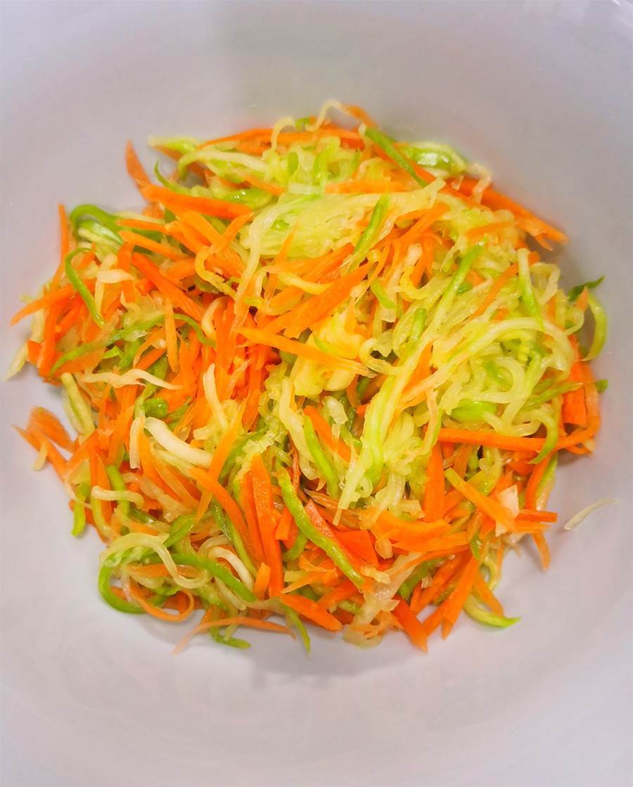 西葫蘆和胡蘿卜都擦成細絲,加適量鹽拌均勻,腌制約10分鐘。