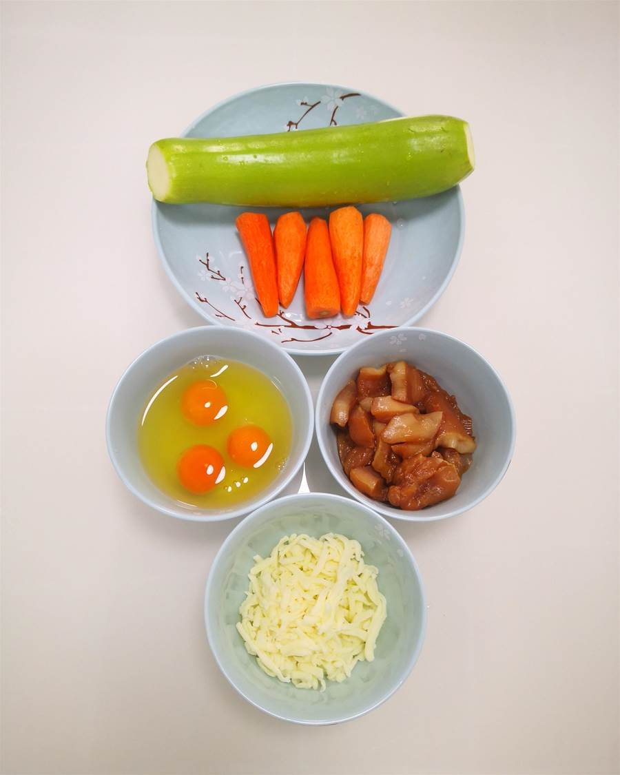 西葫蘆1根,手指小胡蘿卜5根,雞蛋3個,雞胸肉1小塊,芝士碎30克