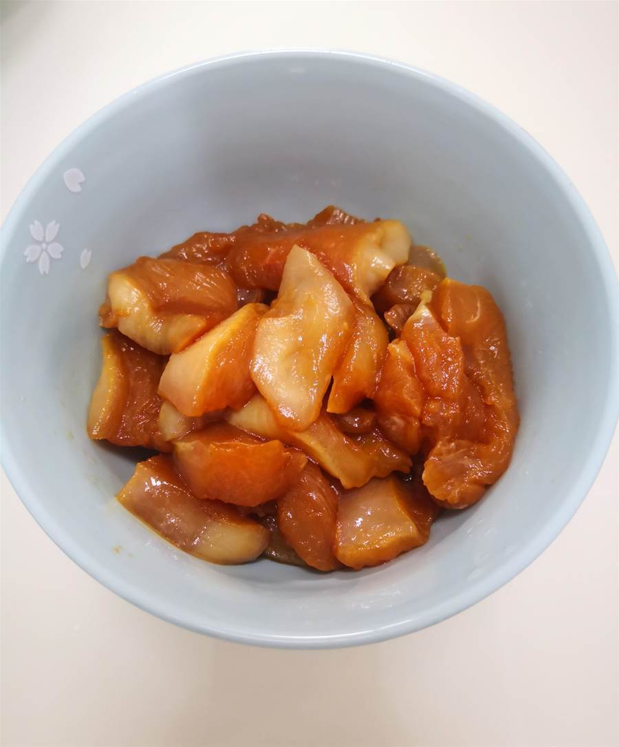 雞胸肉切成薄片,加鹽、生抽、少許老抽、淀粉,反復抓拌均勻后加少許油拌均勻鎖住水分,腌制約15分鐘。