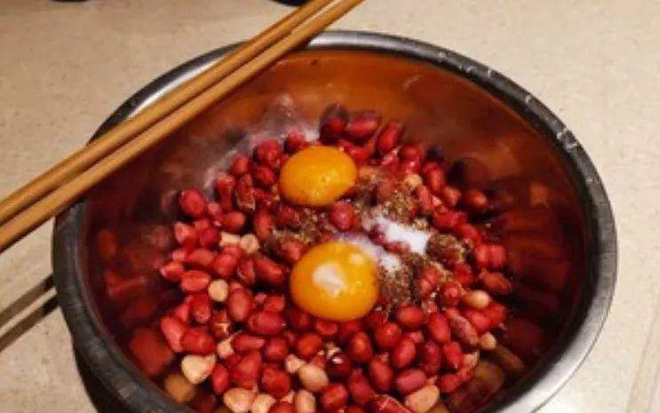 2、花生米放入大碗中,打入2個雞蛋,是全蛋不是蛋黃哦,再加入適量食鹽或白糖,用筷子攪拌2分鐘,讓花生米和雞蛋液混合均勻,裹上一層薄薄的雞蛋液。