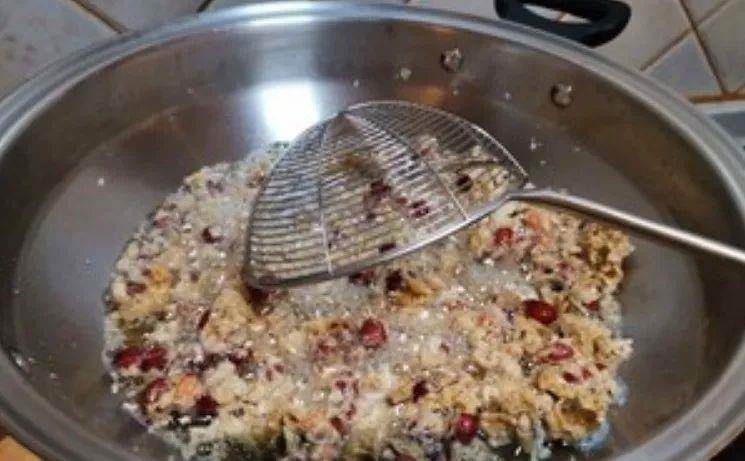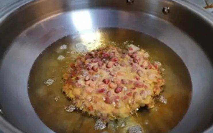 2、炸花生米時要五成熱下鍋,這樣能讓表面的淀粉快速定型,不會掉渣,炸完后油比較干凈,而且不容易糊。花生米復炸1遍,口感更加酥脆,而且不油膩。