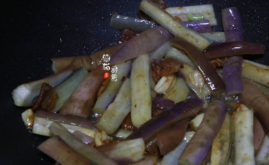 10.把煮軟的茄子條倒入鍋中,小火煸炒,讓茄子條都沾上豆醬還有五花肉的油脂。最后大火收一下汁,加少許清水和生抽,調味拌勻就完成了。