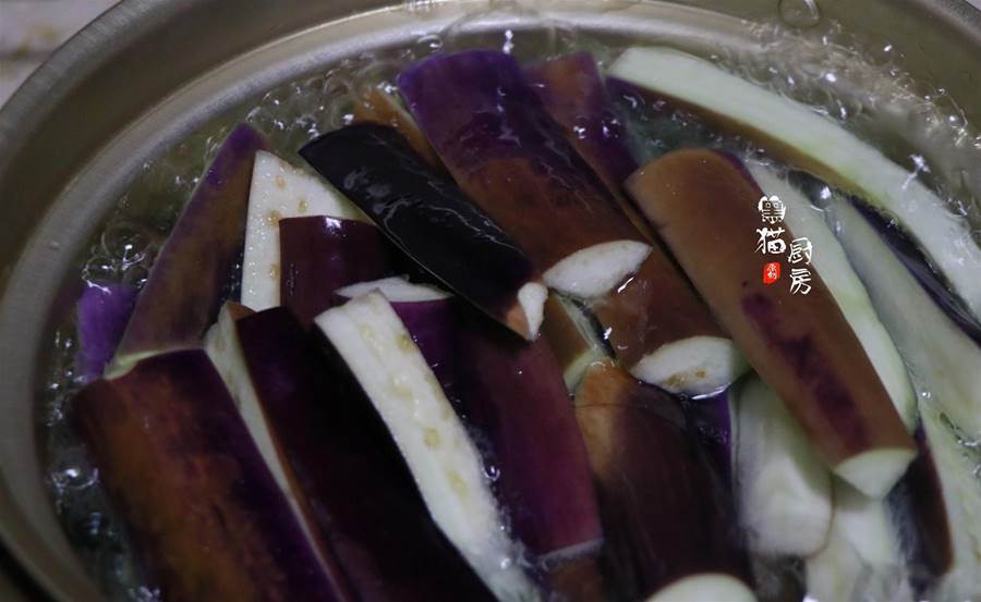 6.煮鍋倒入適量清水,煮開后放入茄子條,小火煮2分鐘。
