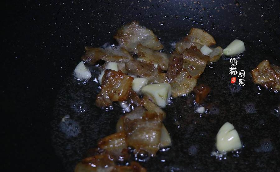 8.下面開始烹制,炒鍋燒熱,倒入蒜末和五花肉,小火把五花肉煎至焦黃,透出五花肉的油脂。