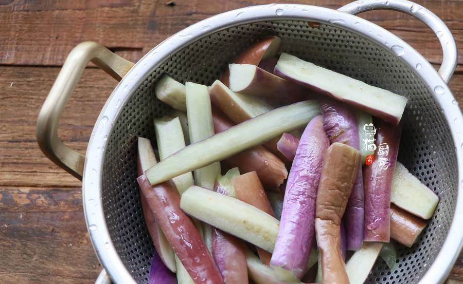做法:1.茄子洗凈切掉兩端,茄子不用削皮,切成細長條,浸泡在加了一勺食鹽的鹽水中,防止茄子氧化變黑。