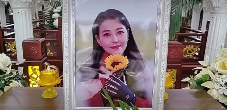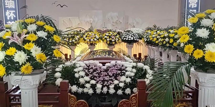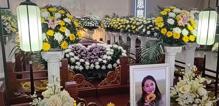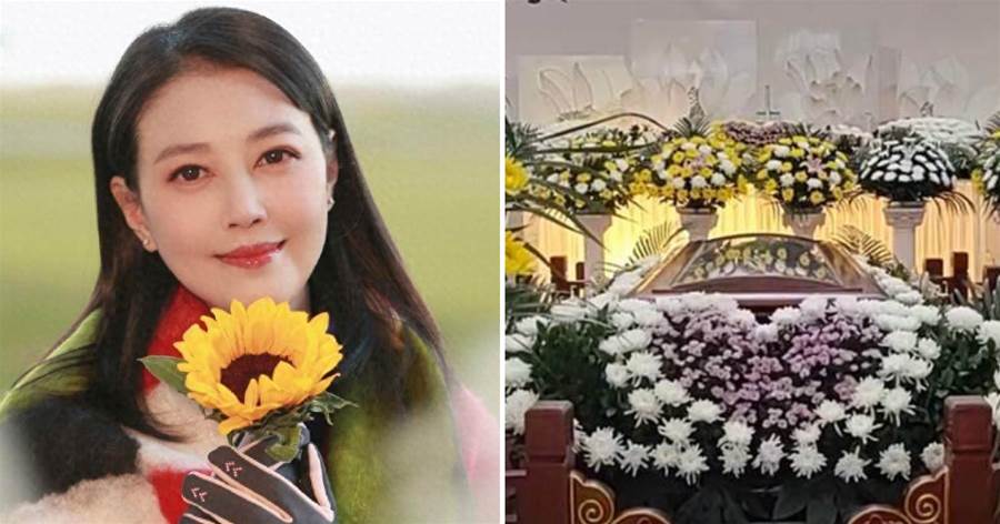 在遺照的兩邊,有兩盞蓮花燈,后方則是一台棺木,被鮮花簇擁,白色與黃色交相輝映,似乎在為周海媚感到惋惜和痛心。這一幕幕太真實,讓人不得不相信,此情此景就是周海媚的追悼會。