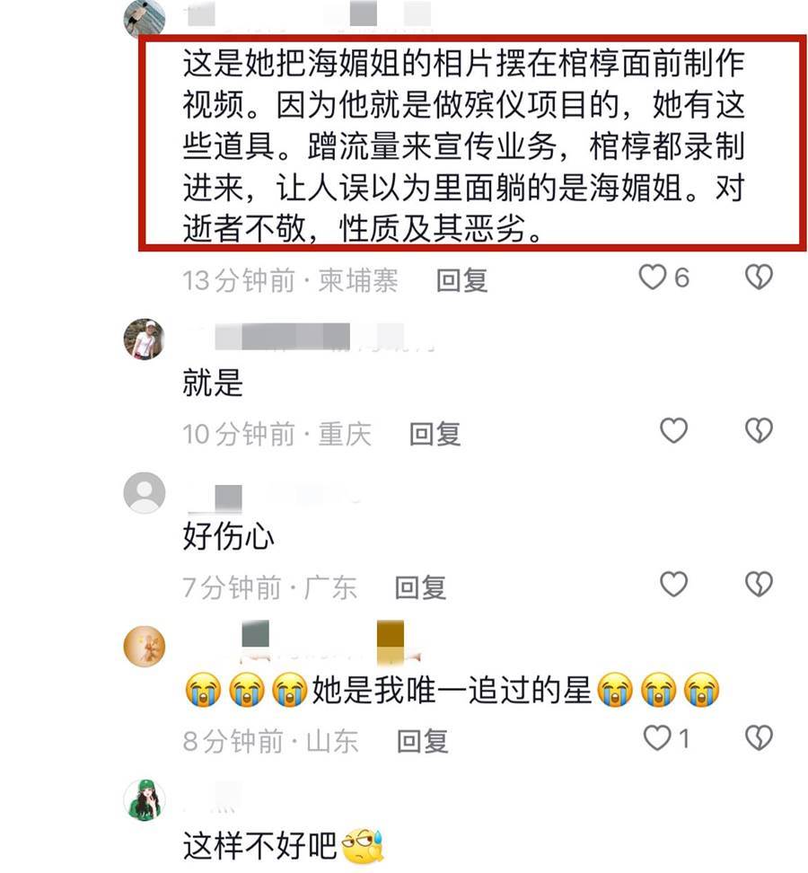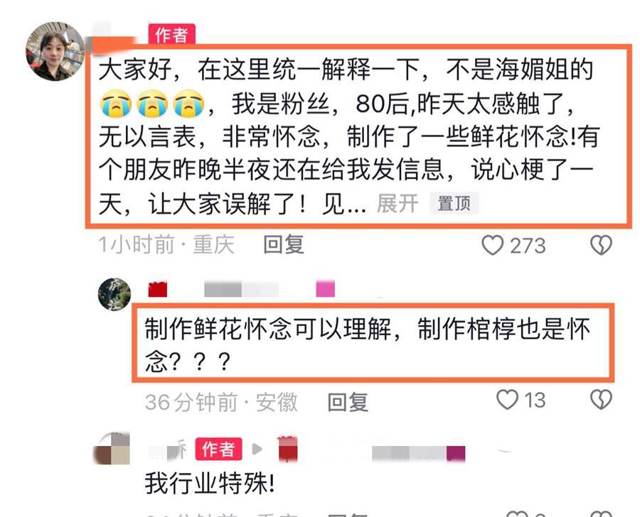引發熱議后,視訊發布者親自辟謠,并表示自己是周海媚的鐵粉,因為是80后,所以聽聞消息感觸頗多,于是便制作了一些鮮花懷念,讓大家誤解了,大家只是以不同的形式懷念而已。