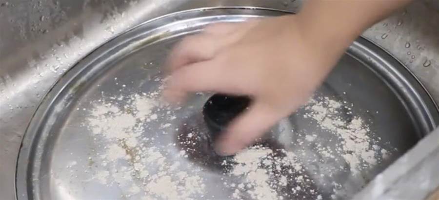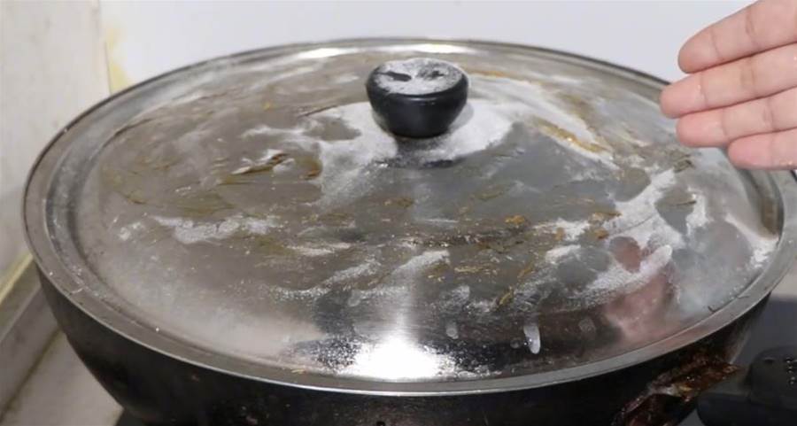最后拿出我們的小神器,就是我們家中的蚊香灰,把它灑落在我們的鍋蓋上面以及反面。蚊香灰是無毒無害的,大家這個可以放心,因為蚊香灰可以吸附上面多余的一些油脂,這時候我們用水,就可以把它清洗干凈啦。