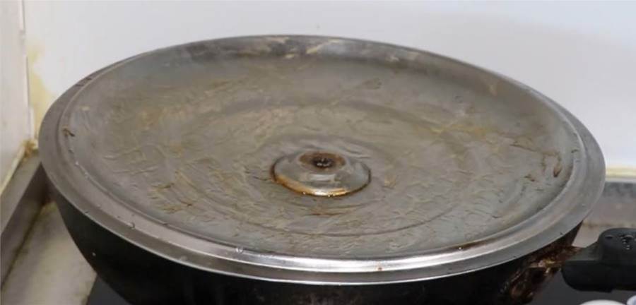 真正的時間到了,這時候我們關火把把這個鍋蓋給取下來,經過洗潔精水蒸汽的熏蒸,這時候上面的油污,就會慢慢掉落下來。
