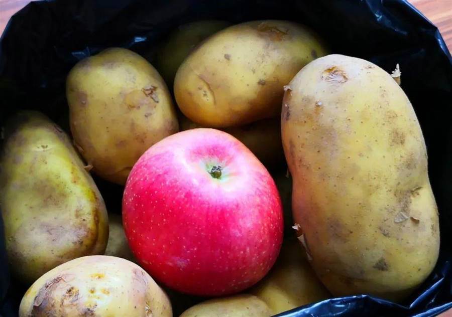 將新鮮的蘋果與馬鈴薯一同存放在同一個容器中,或者將蘋果放在馬鈴薯周圍。