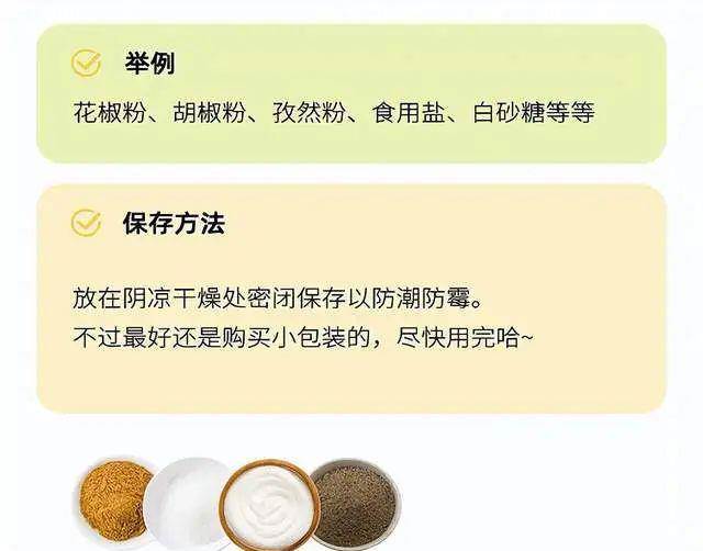一般粉狀的調味品都是需要密封保存的,像花椒粉、胡椒粉、食用鹽、白砂糖等等,如果開封后不按照說明儲藏,會發潮發霉,所以對于這類調味品建議買小包裝的,打開后盡快用完。