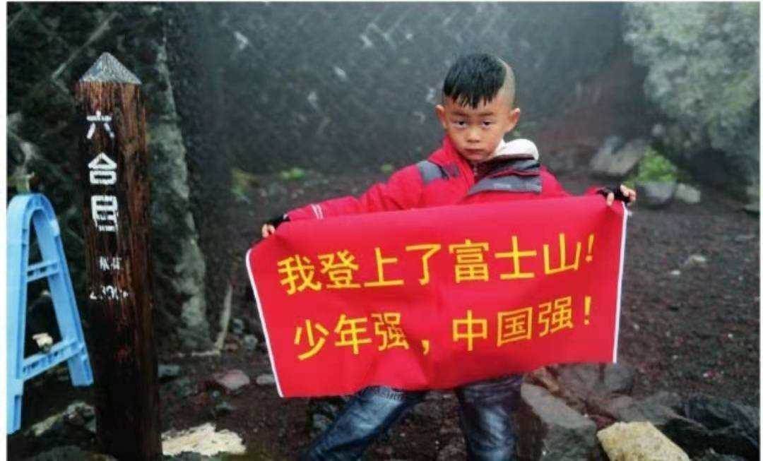 2012年9月,年僅4歲的何宜德在父親的帶領下,花費了15小時成功攀登了日本富士山,并且在山上拉起了「少年強則中國強」的橫幅。